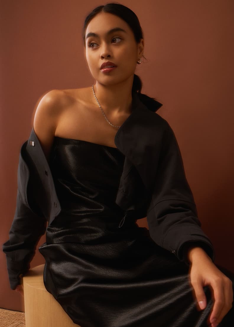 No words, just a smooth satin dress that'll make you star of the night. Shaped in a bias cut with a padded bust, she's perfect for all your main character moments. Plus, you'll love that she comes with an elastic neckline and a back zip that keeps things neat and tidy.